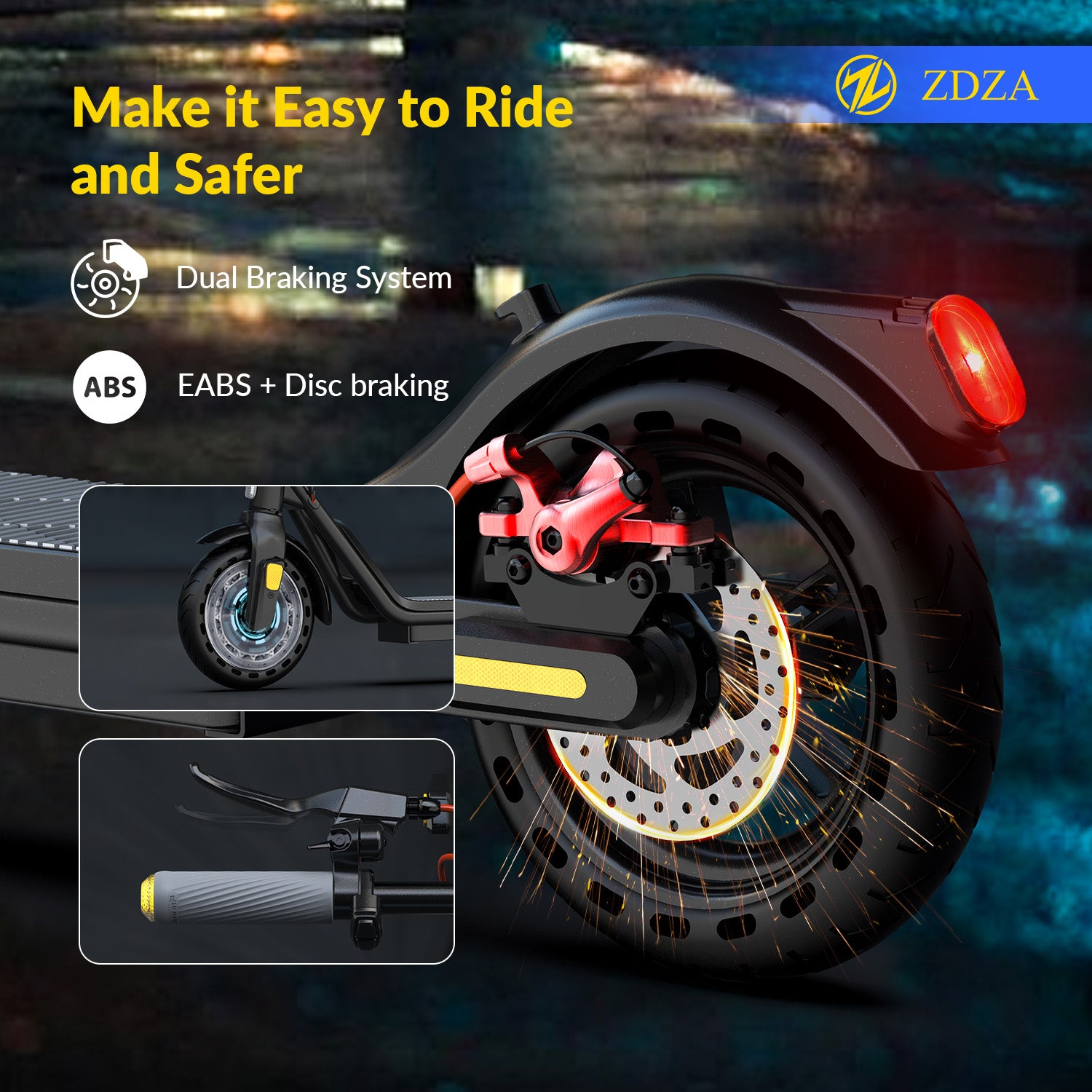 Système de freinage double avant/arrière : associé à l'EABS et à un système de frein à disque mécanique, le scooter électrique garantit un freinage réactif et fiable à n'importe quelle vitesse