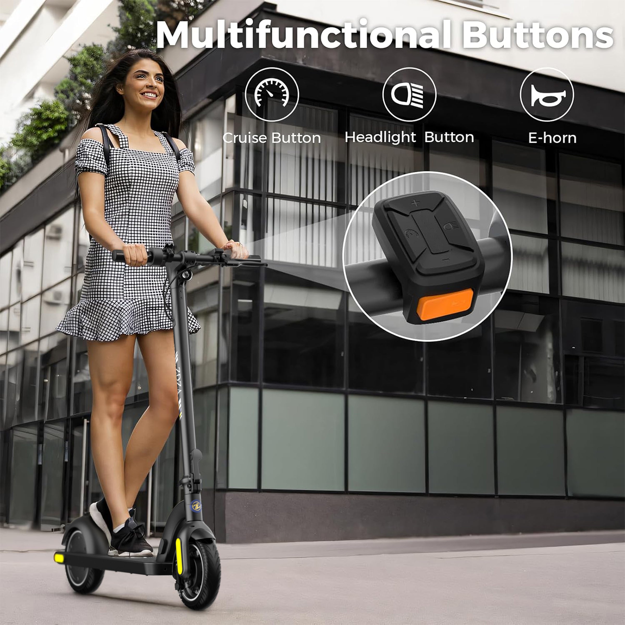 - Smart Control and Built-In Security - Experience effortless riding with our intuitive multifunctional button console, designed by expert engineers for easy management of the headlight, speed modes, E-horn, and cruise control—all at your fingertips. Plus, safeguard your investment with our electric code lock, ensuring your scooter remains secure when parked in public spaces. Enjoy a smooth, user-friendly ride with peace of mind wherever your journey takes you!