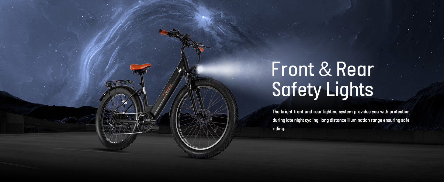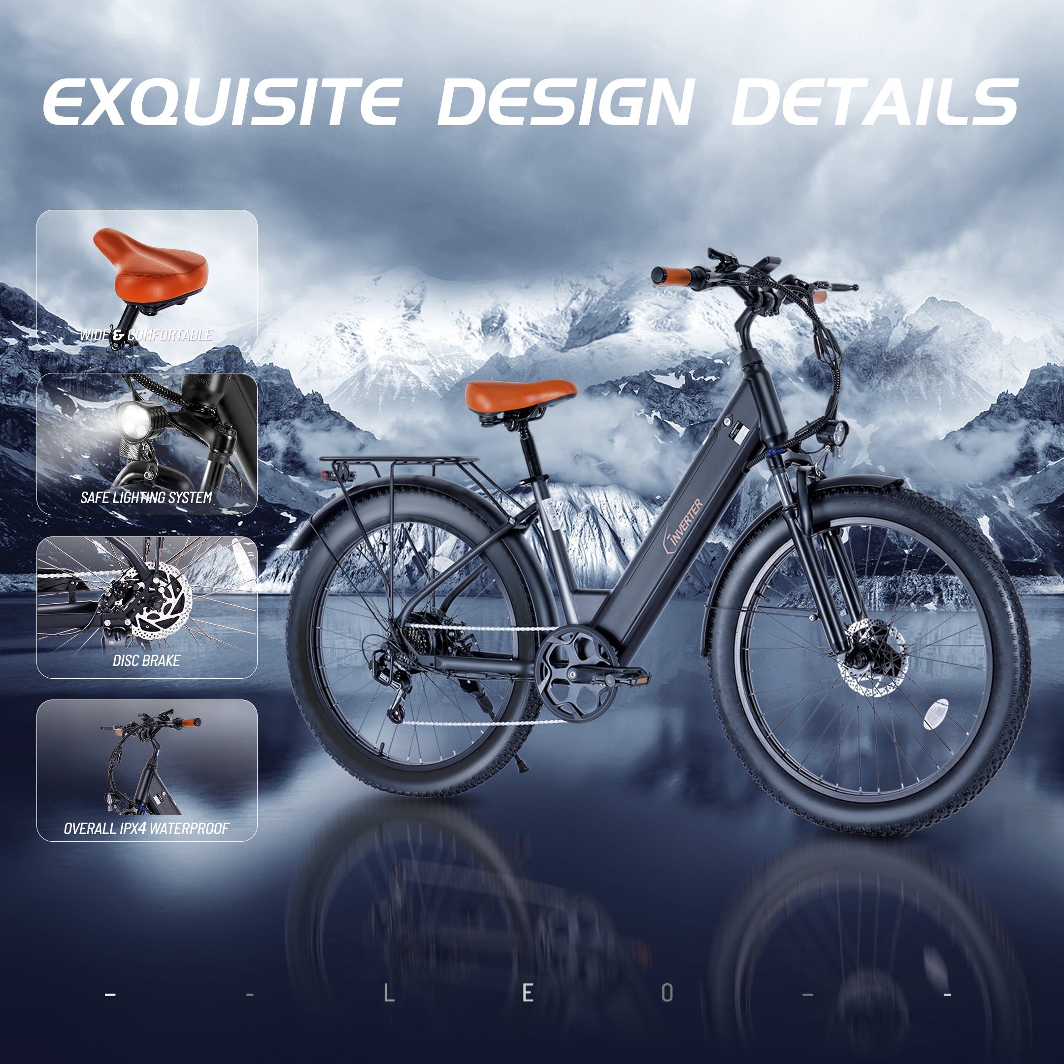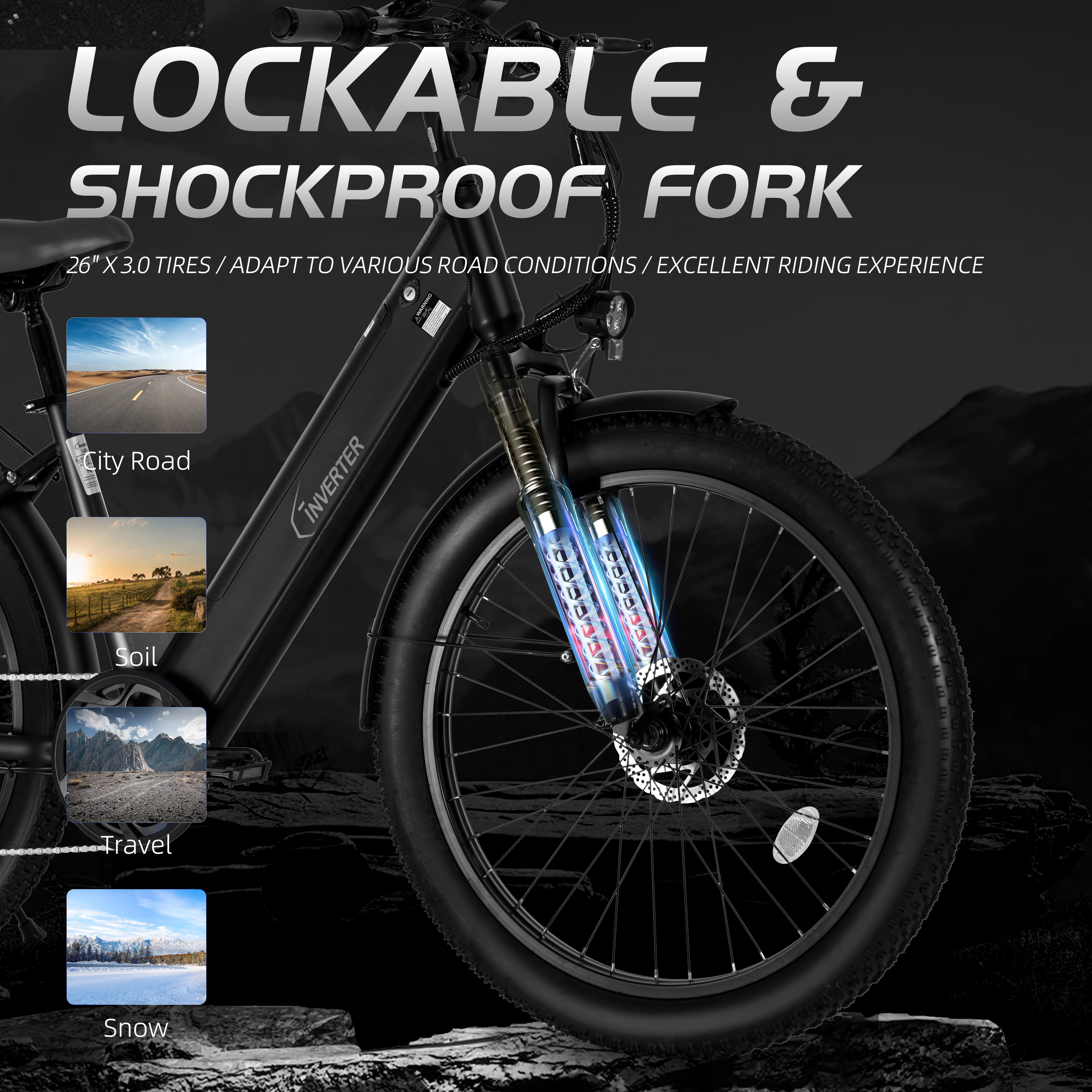Comfortable and Smooth Ride - Equipped with 26"x3.0" fat tires and dual lockable front suspension, the LEO electric city commuting bike ensures a smooth and comfortable ride on any terrain, from daily commutes to outdoor adventures. The combination of large tires and front suspension absorbs bumps and tackles mountains, city roads, beaches, rocky paths, and urban environments with ease.